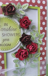 The blooms are from Kaisercraft mini paper blooms and the leaves have been stamped, coloured and fussy cut using AnnaBelle Stamps 'ballerina rose' stamps. Here is a close up of the blooms ...